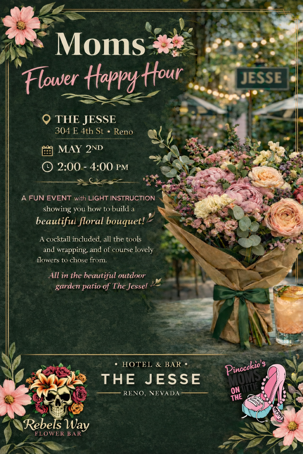 Bouquet build in the garden at The Jesse in Downtown Reno, a cocktail included, beautiful flowers to chose from, light fun floral instruction. Everything you need to make your own bouquet. May events benefit local breast cancer fighters being supported by Pinocchios Moms on the Run. Grab your girlies and come build a bouquet.